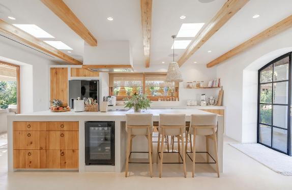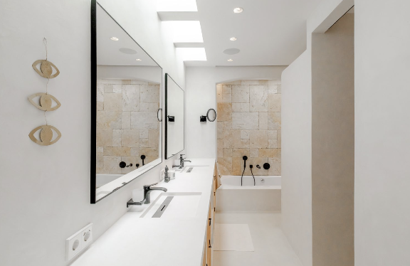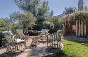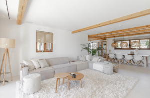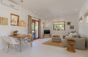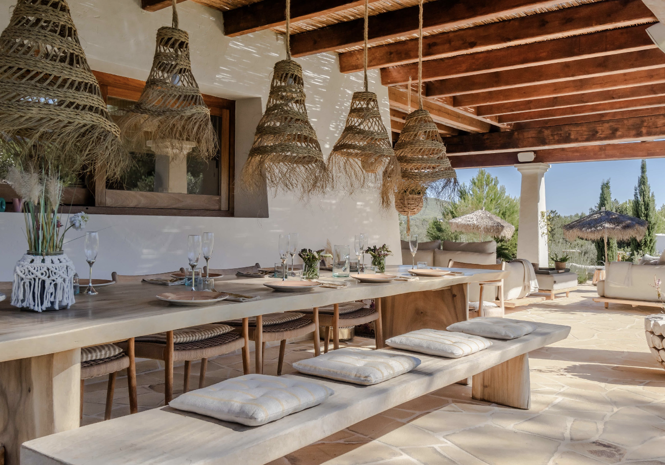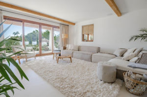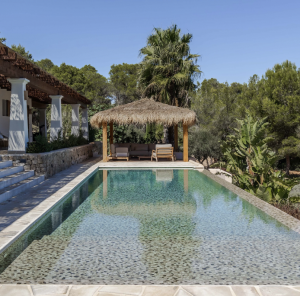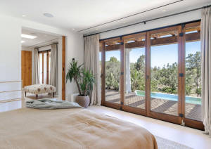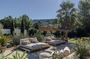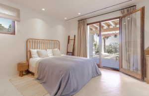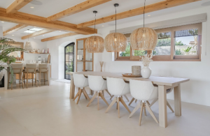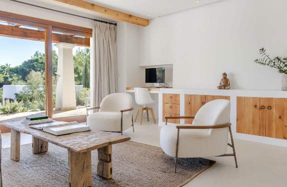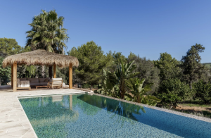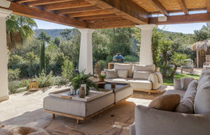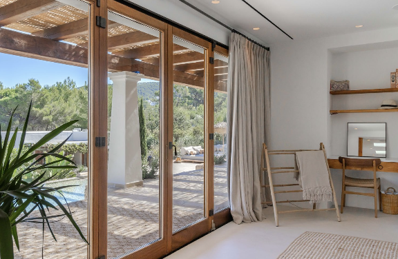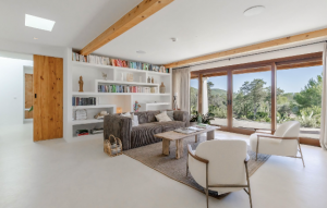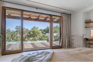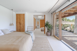 Upon entering this flawless bohemian-chic villa, you will immediately notice its cutting-edge and stylish charm. The interior seamlessly blends modern style with inviting warmth and features an array of trendy accessories. The open living room flows effortlessly from the chill-out rooms with their libraries to the main living room with its large TV, all connected to the dining area and kitchen. Each room offers stunning views of the beautiful veranda and infinity pool, welcoming natural light and enhancing the Balearic lifestyle inside and out. The home is equipped with a modern kitchen and high-tech appliances, making it perfect for culinary enthusiasts. The main residence has 5 absolutely stunning bedrooms as well as 3 bathrooms, providing ample space for guests while ensuring their privacy. The centerpiece of this residence is the spacious and beautifully designed master bedroom, which features a luxurious ensuite bathroom with minimalist black elements. Just around the corner, a separate dressing room flows seamlessly into the bedroom and offers breathtaking views of the pool and shaded veranda through floor-to-ceiling glass windows. Each of the other bedrooms are also carefully decorated and have either a private or a shared bathroom that can be accessed from either side. This beautiful home is equipped with top-of-the-line technologies, including a Domotica home automation system that controls the lighting, sound system and air conditioning to ensure year-round comfort.