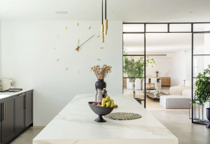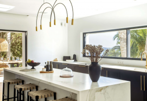 From the upper level, a sweeping stone staircase leads down to the lower level, where a large dining and living room benefit from the natural light from the large windows and the stunning views of the Mediterranean Sea.
