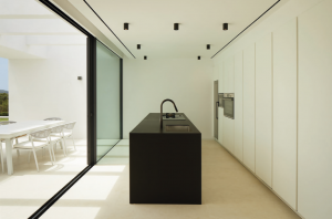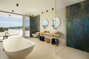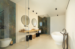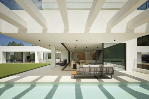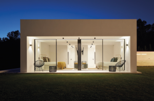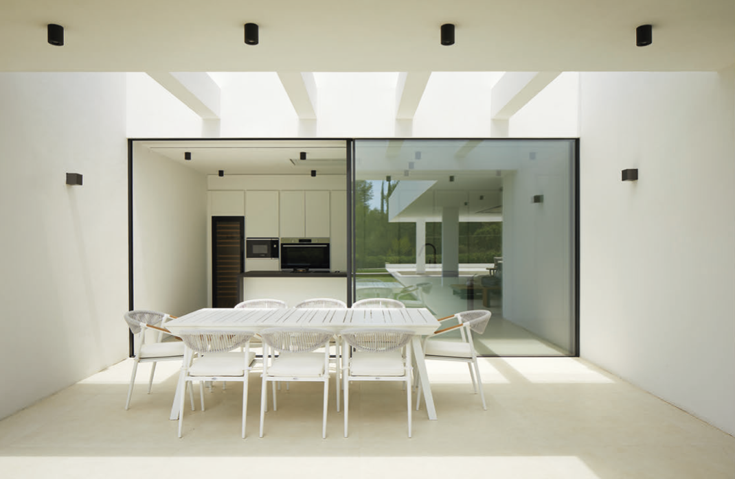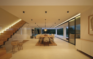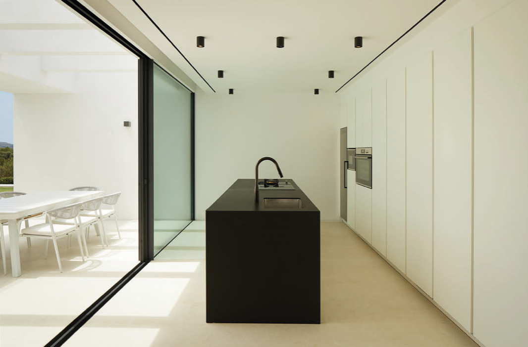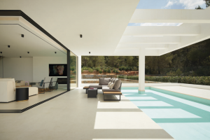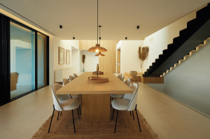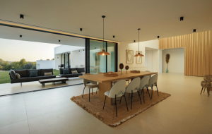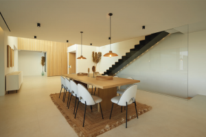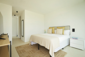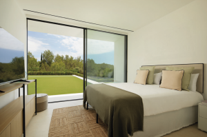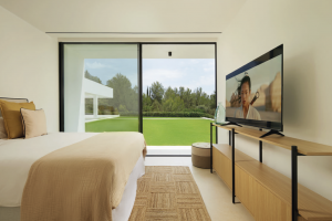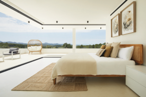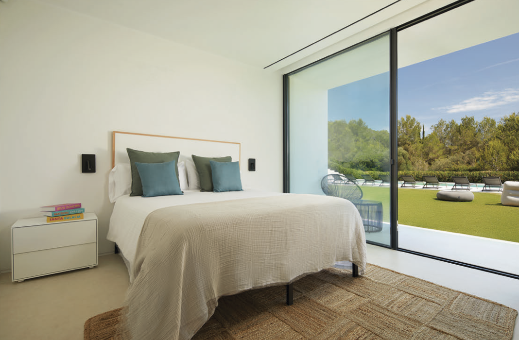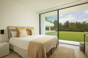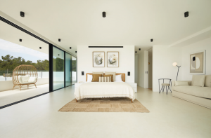 The interiors include a spacious master suite with a walk-in closet and an en-suite bathroom with both a bathtub and shower. There are four additional double bedrooms, each with en-suite bathrooms, a stylish open-plan living and dining area, and a modern kitchen. Full-length sliding glass doors in the master bedroom and living room create a seamless flow between the indoor and outdoor spaces, bathing the villa in natural light.