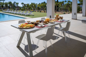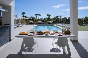 This luxury villa is surrounded by wide garden with swimming pool and sun terrace, a guest house, BBQ, gym and mini Club among others.