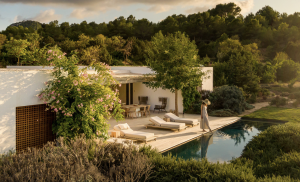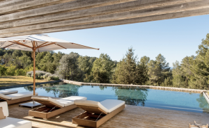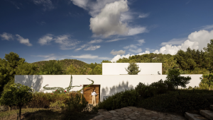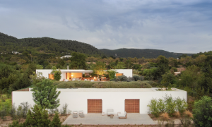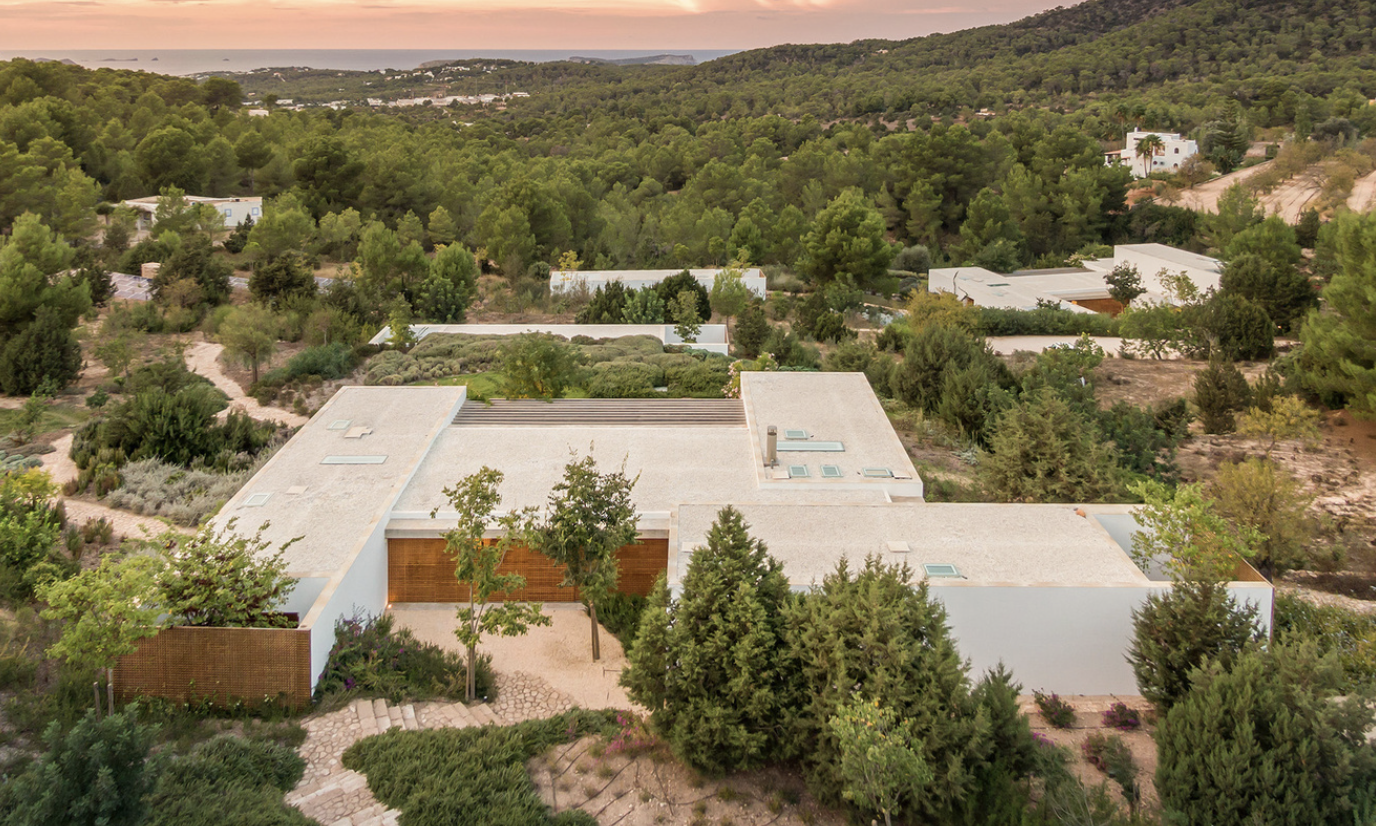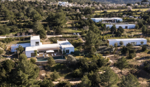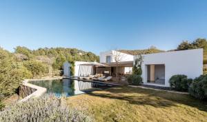 The landscaping is designed by Isabel Duprat, another “guru” of marked world fame, and integrates the house in 15,000 m2 of wild nature in such a way that, rather than being built, it seems that it has sprung up naturally in the landscape. It consists of hand-carved Ibizan stone paths and is crowned by two swimming pools, one of them 37 meters long, and the other heated for recreation.