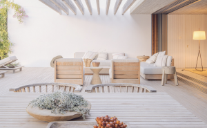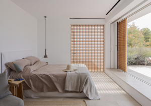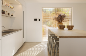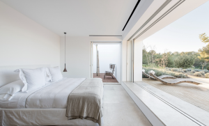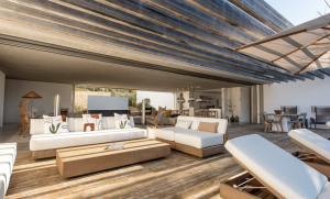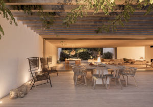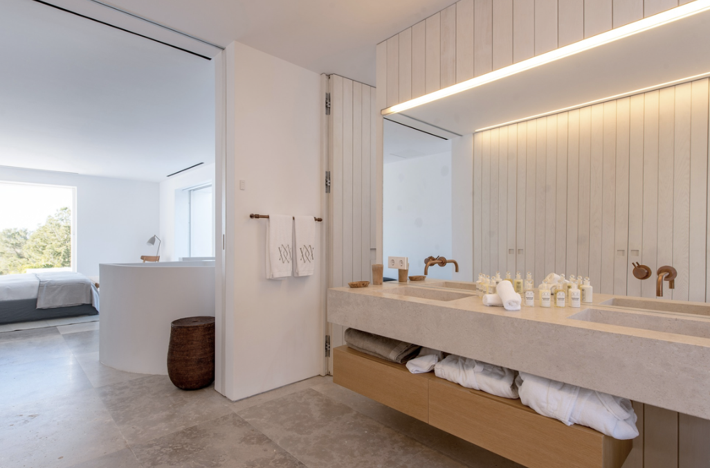 The finishes combine the forcefulness of monolithic marble weighing up to 200 kilos with the delicacy of Vola faucets finished in bronze, as well as the robustness of solid teak and Ibizan stone floors in the exteriors with the majesty of solid oak in the interior furniture, highlighting the cabinets also made of solid oak with internal LED lighting. All windows and doors are Panoramah pocket windows. Including an impressive 13m living room window that silently opens at the touch of a bouton.