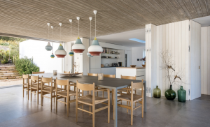 Entering the villa, one discovers an interior full of original works of art, such as tables by Jader Almeida, Ayush Kasliwal and Rodolfo Dordoni, chairs by Hans Wegner and Paola Navone, lamps by Clara von Zweigbergk and Greta Grossman, sofas by Piero Lissoni, Gervasoni beds, Bulthaup kitchens, Gaggenau appliances, and a Bang & Olufsen audio-visual system and Apple TV in all living rooms and bedrooms.