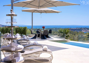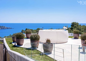 Open plan living area (150mq) with stunning sea view connected with an enormous terrace (200mq) with pool (9x3m)