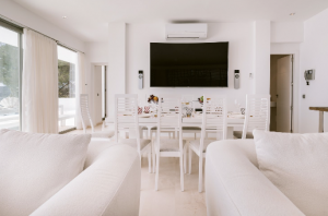 This beautiful and family-friendly villa is located on a gentle hillslope in the prestigious community of Roca Llisa, a quiet and serene area close to beautiful beaches on the outskirts of Ibiza Town. You don’t have to look far for relaxing beach days during your holiday; the pearly white sandy beach of Talamanca can be reached within 15 minutes and if you want to explore the unspoilt beaches of Ibiza, you will find picturesque coves such as Cala Olivera and Cala Espart just a 10-minute drive away. In addition to beach lovers, golf enthusiasts will also appreciate this location, as the villa is just minutes away from Ibiza’s only golf course. This location offers no shortage of entertainment options, the elegant Marina Botafoch on just a 10-minute drive away offers a range of leisure activities. With a beautiful promenade next to the world’s most impressive yachts, gourmet restaurants, luxury boutiques and vibrant nightlife entertainment is at your fingertips. The culturally rich and vibrant Ibiza Old Town is 15 minutes away, where you can enjoy local restaurants and bustling (rooftop) bars. This amazing villa is only a 20-minute journey from the airport, ensuring you can start your ultimate Ibiza vacation shortly after your arrival on the island.