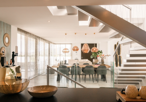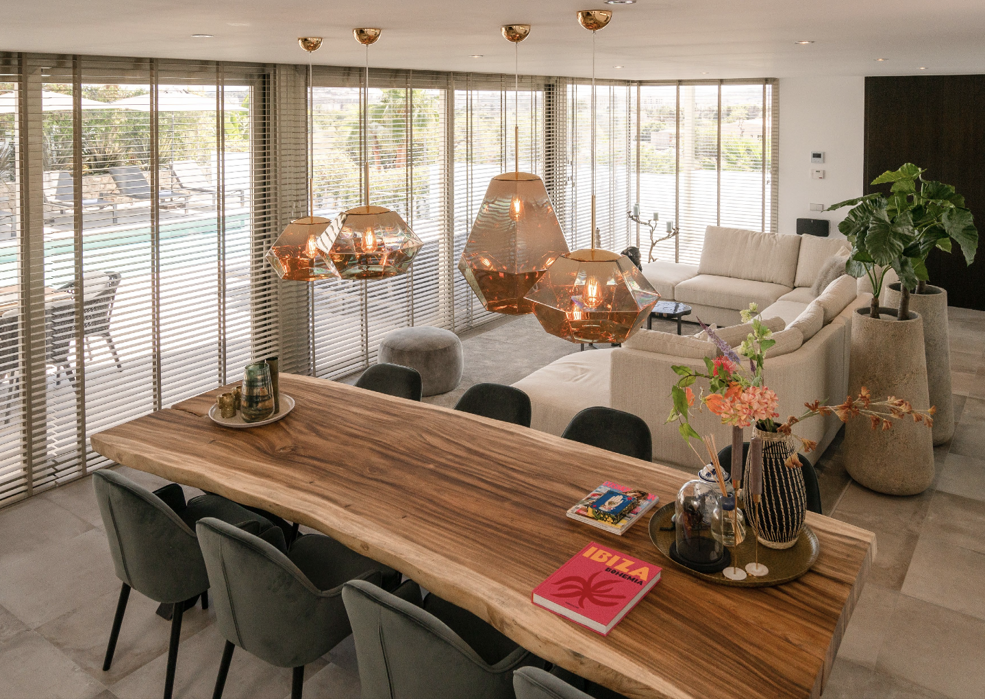 The holiday villa consists of three levels, with the open living room located at pool level. Characteristic are the spacious sliding doors and light gray tiles of natural stone that effortlessly connect the outside with the inside. In the living room there is a large corner sofa in off-white amidst beautiful plant pots and a spacious dining table that cleverly separates the lounge from the kitchen.