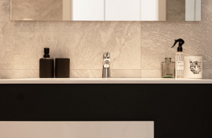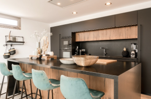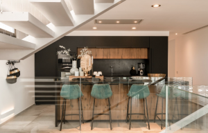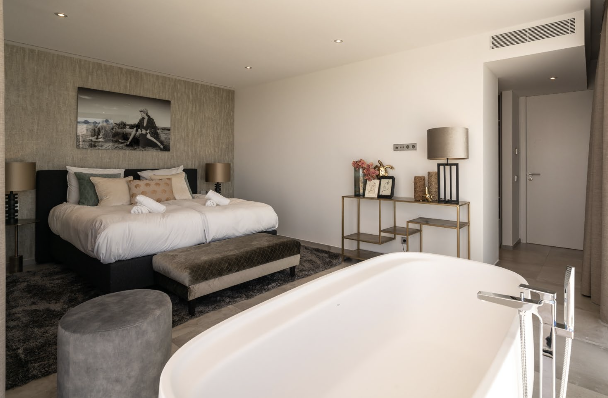 The open kitchen immediately catches the attention through the combination of matte black and wood. The kitchen island also functions as a bar, where flannel armchairs in beautiful blue can accommodate four people. The top is made of black natural stone and the extractor hood is integrated into the ceiling. Furthermore, the kitchen is fully equipped with high-quality built-in appliances from Balay and the water in the entire villa can be drunk thanks to an advanced filter from the tap. A special detail is the stylishly concealed access door that provides access to the laundry room with an extra refrigerator, washing machine and dryer. On this level is also the guest toilet and three bedrooms. These all have an adjoining bathroom with rain shower and floating toilet.